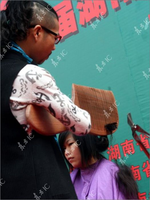 Hairstylists use a giant comb and scissors, both 1.3 meters long, on a girl in Changsha, Hunan Province. The comb and scissors are the largest ever used by Chinese hairstylists.